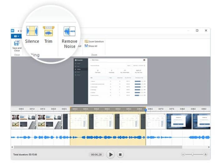 There is an option for removing background noise, also you can adjust the audio fade-in or fade-out with the FreeCam.
